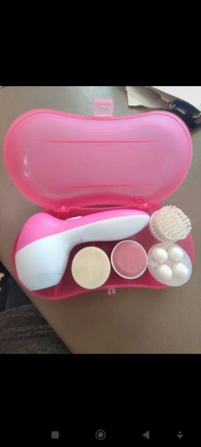 Masse, nettoie le visage. Plusieurs embouts. Fonctionne à piles