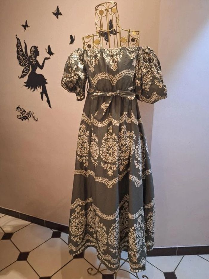 Robe kaki & imprimé blanc - col bardot élastiqué laissant les épaules dénudées - courtes manches bouffantes - coupe cintrée par une taille élastique qui s'adapte à votre morphologie + ceinture ton sur ton - 100% coton - taille unique idéale pour les tailles 38 & 40 - fabrication italienne - état sans défaut ps : je ne fais pas de photo portée #robekaki #robelonguekaki #robelonguecoton #robelongueimprimée #robelonguecolbardot #colbardot #robeepaulesdénudées #robeépaulesnues