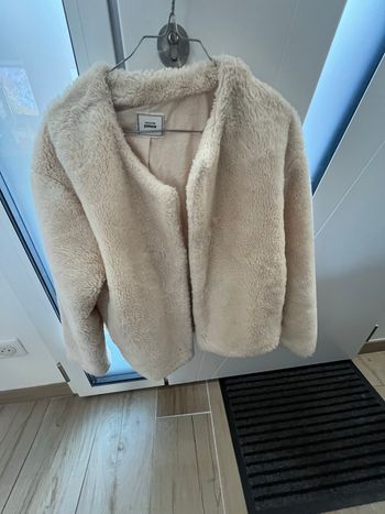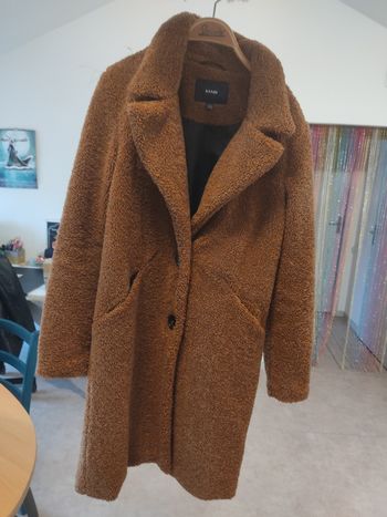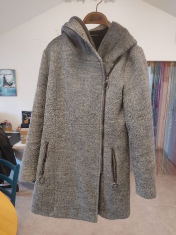 Manteau long en laine bouillie avec une capuche, couleur noir, s'attache avec un bouton au milieu et une ceinture large. Taille 40 Très bon état