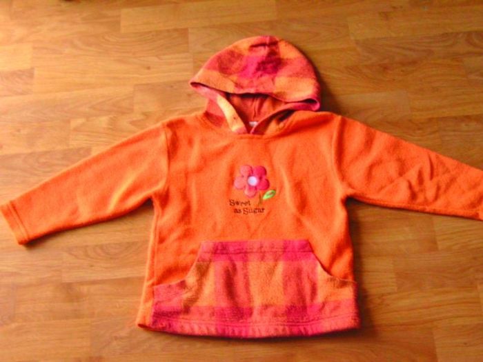 Sweat shirt pour fillette, taille 5 ans, de couleur citrouille, en matière polaire avec une capuche et petite fleur devant rappelant le motif de la capuche. TBE
