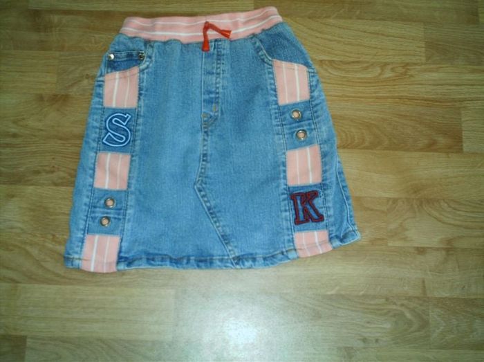 Jupe fillette taille 6 ans en jean élastique avec la ceinture rose et des empiècements rose également Très originale TBE .