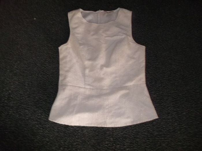 Top CAMAIEU, taille 36 (voir mesures), habillé de couleur crème avec des filaments dorés, se fermant sur l'arrière par fermeture zip, doublé sur le buste. TBE Aisselle à aisselle : 43 cms Longueur : 54 cms