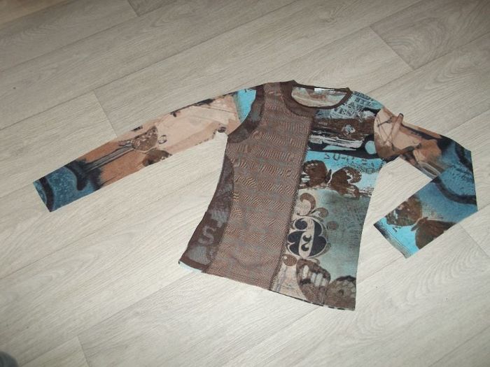 Tee shirt de marque PROMOD, taille 38, en voile tulle multicolore dans les tons marrons et turquoises, une partie en Prince de Galles, manches longues. TBE