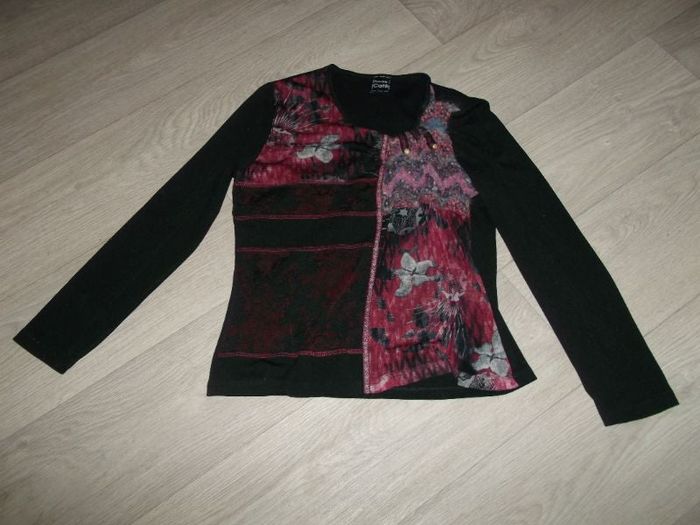 Tee shirt de marque PAUSE CAFE, taille 44, en voile doublé sur le buste de couleur noir et multicolore devant, avec un empiècement en laine et mohair incrusté de petits clous mordorés qui donnent du chic à ce tee shirt , le dos et les manches sont unis. TBE Epaule à épaule : 39 cms Aisselle à aisselle : 47 cms Longueur : 57 cms