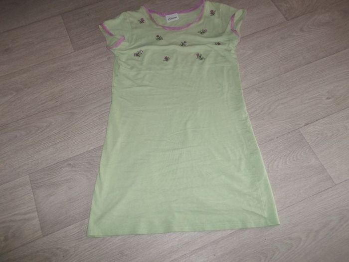 Chemise de nuit de marque ETAM, taille 36, en coton de couleur verte avec des fleurs sur le haut, liserés violine autour des manches et du cou. TBE