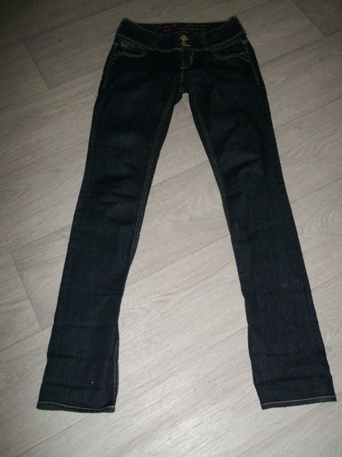 Jean de marque LE TEMPS DES CERISES, taille 24 US soit 34 FR, de couleur bleu foncé, se fermant devant par double boutonnage siglé et une fermeture zip, 2 poches avant et 2 sur l'arrière, double car une partie zippée, passants pour ceinture, petit sigle sur une poche arrière, plaque en cuir siglée sur la taille arrière, légèrement élastiqué. TBE Tour de taille à plat : 35 cms Longueur : 107 cms