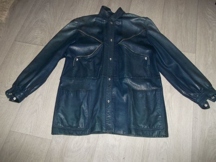 Veste mi longue en cuir très souple de couleur bleu outremer, taille 38 /40 (voir mesures pas d'étiquette) se fermant devant par des boutons pressions nacrés, 2 grandes poches poitrine et 2 sur le bas, des liserés dorés sur le haut, boutons nacrés également au bas des manches. Bon état car différences de couleur par endroits et des tâches. Très originale. Epaule à épaule : 41 cms Aisselle à aisselle : 53 cms Longueur : 70 cms