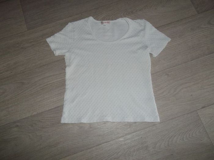 Tee shirt de marque AQUARELLE, taille S, avec des motifs extérieurs style nid d'abeilles, de couleur blanc cassé, en matière meryl et élasthane donc fluide et légèrement élastiqué. TBE