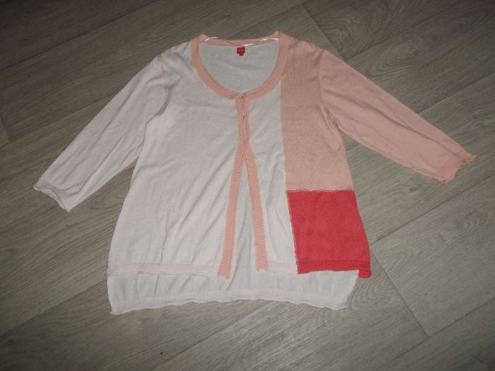Gilet de marque MISS CAPTAIN, léger, taille 1/S/36, (grand, voir mesures) multicolore tons blanc, corail et saumon, se fermant sur le haut par 3 boutons, manches 3/4. NEUF Epaule à épaule : 41 cms Aisselle à aisselle : 47 cms Longueur: 60 cms