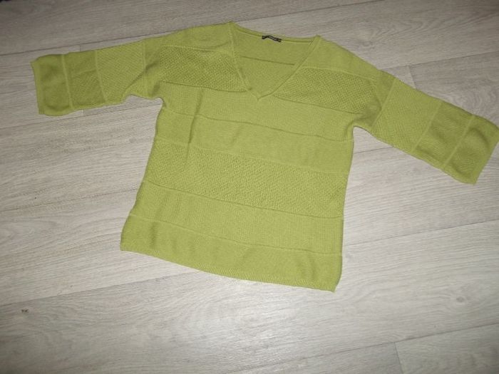 Pull de marque PROMOD, taille 40 (voir mesures plus d'étiquette), léger, de couleur vert anis, col en V manches 3/4. TBE Epaule à épaule : 58 cms Aisselle à aisselle : 52 cms Longueur : 65 cms