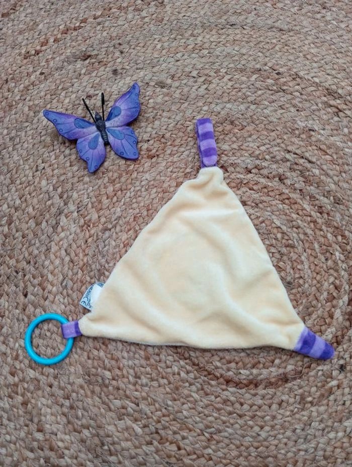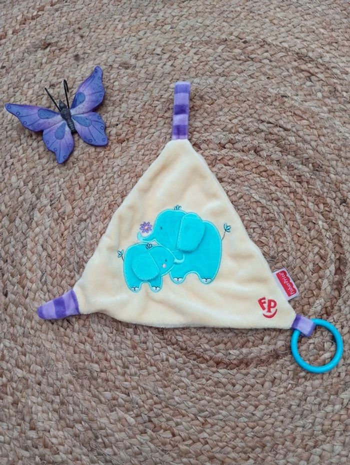 #DCR_fisherprice #DCR_elephant Fisher Price Doudou triangulaire jaune bleu Éléphant Broderies C009