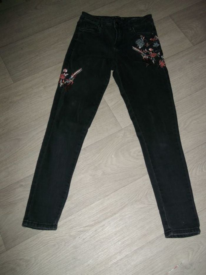 Jean de marque VS MISS, taille haute M/38, de couleur noir, avec des broderies fleurs et oiseaux multicolores, se fermant sur le devant par fermeture zip et un bouton, 2 poches avant et 2 sur l'arrière, passants pour ceinture, légèrement élastiqué. TBE Tour de taille à plat : 33 cms Longueur : 96 cms