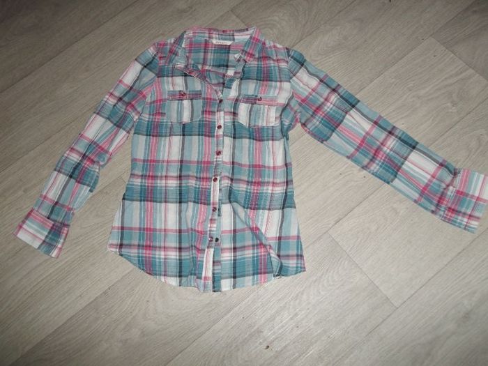 Chemise de marque CAMAIEU, taille 36, à carreaux de couleur bleu turquoise, bleu outremer, blanc et fuchsia, se fermant devant par des boutons pressions roses nacrés, ainsi qu'aux bas des manches et des 2 poches poitrine. TBE Epaule à épaule : 35 cms Aisselle à aisselle : 46 cms Longueur : 60 cms