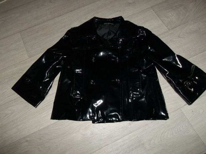 Veste de marque AVANT PREMIERE GALERIES LAFAYETTE, taille 42 , en simili cuir brillant vernis, PVC vinyl, de couleur noir, se fermant devant par de gros boutons noirs et argentés, 2 poches côtés, manches 3/4 . TBE Epaule à épaule : 41cms Aisselle à aisselle : 50 cms Longueur : 55 cms