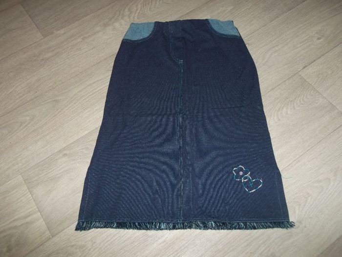 Jupe dégriffée, taille38/40 extensible par son tissu façon jean foncé avec des parties bleu turquoise et également des strass turquoise au bas de la jupe, petite ouverture sur les côtés au bas de 12 cms. TBE Tour de taille à plat sans extension : 35 cms Longueur : 66 cms