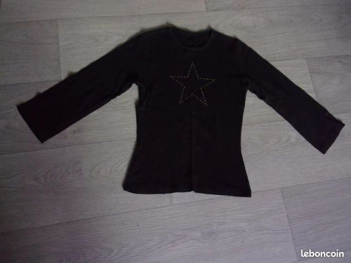 Tee shirt dégriffé, taille 36/S/1, de couleur noir avec devant une étoile cloutée dorée. TBE