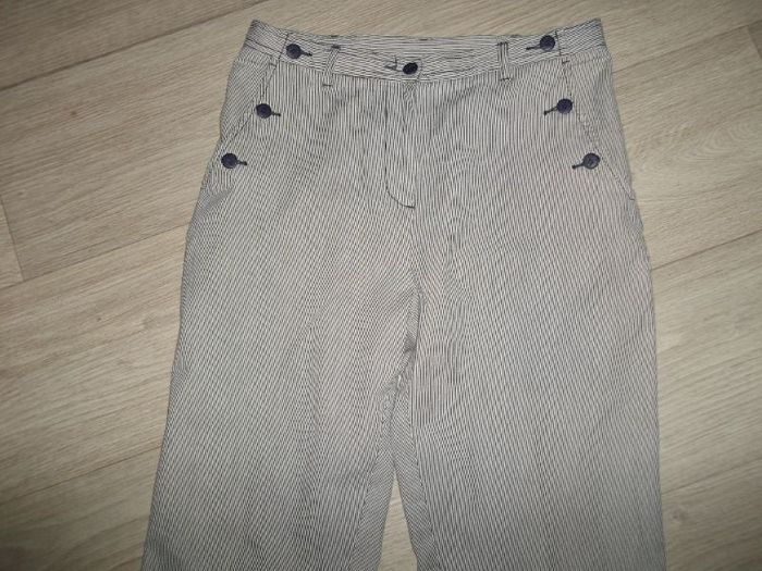 Pantalon, pantacourt de marque BURTON, taille 38, rayé bleu marine et blanc, se fermant sur le devant par fermeture zip et un bouton bleu marine, assortis à ceux en décos sur les 2 poches côtés et sur la taille, passants pour ceinture, 2 fausses poches à l'arrière. TBE Tour de taille à plat : 38 cms Longueur : 91 cms
