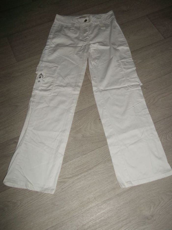 Pantalon de marque ICI ET MAINTENANT, taille 38, épais, de couleur blanc, se fermant devant par fermeture zip et un bouton siglé, passants pour ceinture, 2 poches le long des jambes à rabats et galon sur oeillets, 2 fausses poches à rabats sur l'arrière. TBE Tour de taille à plat : 36 cms Longueur : 97 cms