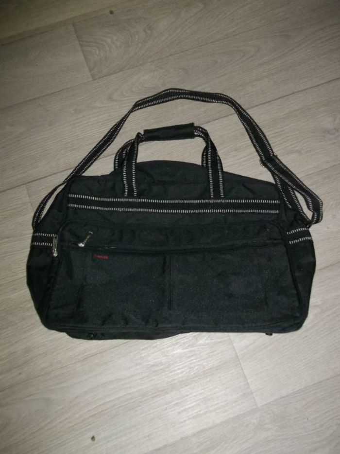 Petite valise de marque SUNRISE, légère en nylon de couleur noire, se fermant sur le dessus par fermeture zip aller retour, 1 grande poche zippée devant et 1 plus petite, poignée non amovible pour porté main avec un scratch, bandoulière pour porté épaule tenant d'un côté par mousqueton , 4 picots de protection dessous. TBE Dimensions : 35 x 45 x 15 cms