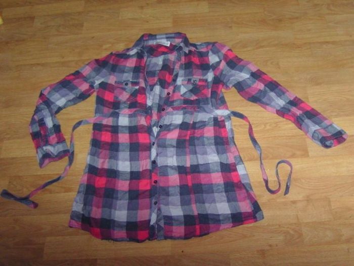 Tunique de marque JENNYFER, taille M, se fermant devant par des boutons, un lien pour serrer à la taille, de couleur bordeaux rouge gris noir rouge, 2 poches poitrine. TBE Epaule à épaule : 38 cms Aisselle à aisselle : 47 cms Longueur : 79 cms