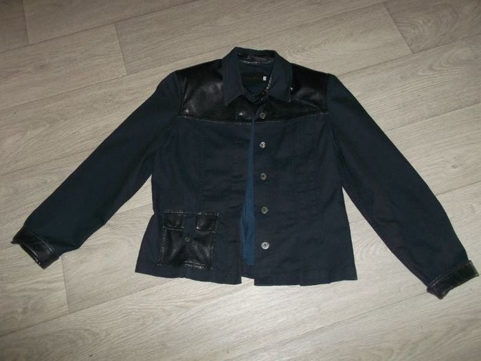 Veste de marque PAUL BRIAL, taille 4 soit 42, en jean léger de couleur bleu foncé, légèrement élastiquée, se fermant devant par des boutons, avec des empiècements simili cuir bleu marine, 1 poche à rabat au bas en simili cuir, marque inscrite sur le dos. TBE Epaule à épaule : 43 cms Aisselle à aisselle : 50 cms Longueur : 65 cms