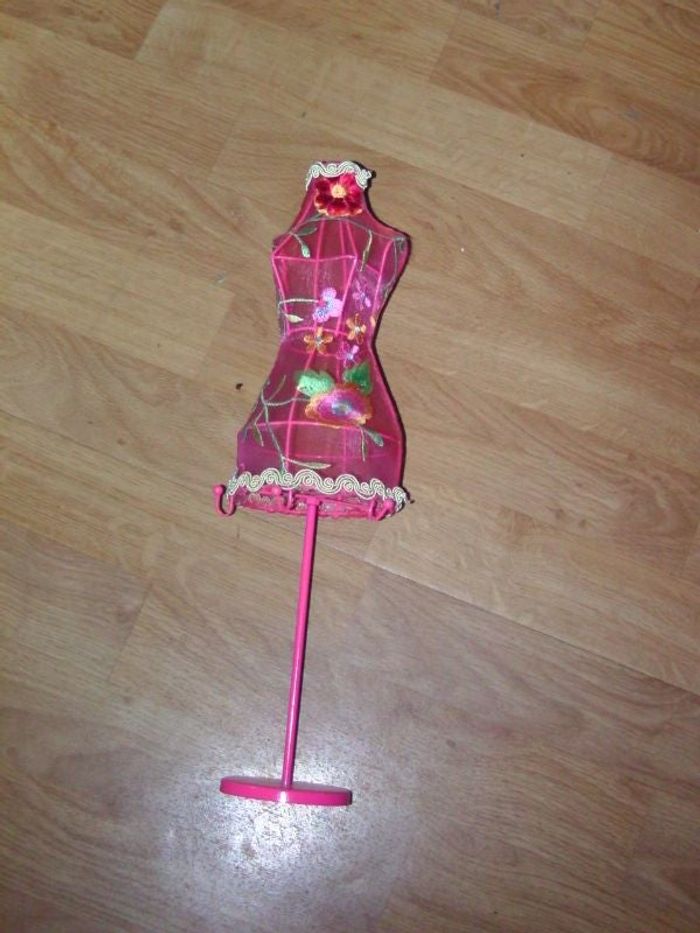 Porte bijoux en forme de buste femme de couleur rose en voile avec des fleurs brodées, 3 petits crochets, hauteur totale 39 CMS NEUF
