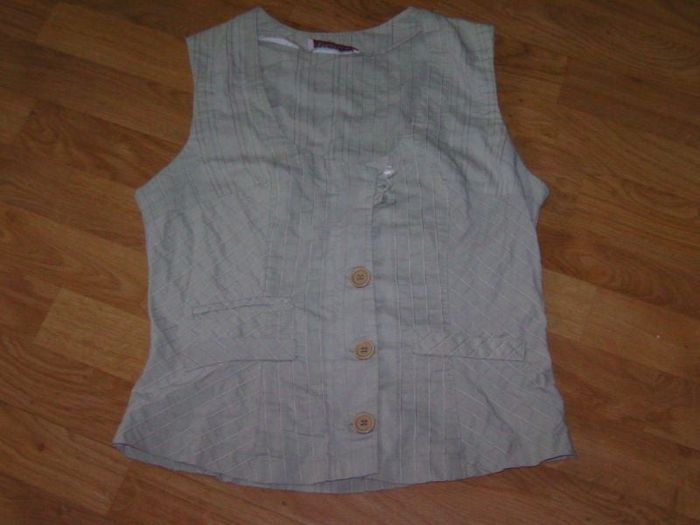Gilet en coton mélangé, de marque MODEL, taille 3 ou 40, de couleur kaki clair avec des lignes dans le tissu, se fermant devant par des boutons dont 3 petits vers le haut, 2 fausses poches et 1 vraie. TBE