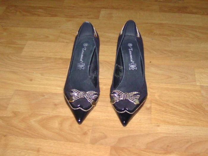 Escarpins de marque TOSCANIA, taille 38, en simili daim noir et des surpiqures dorés en déco, petit noeud devant sur du simili cuir noir vernis, talon vernis noir également d'une hauteur de 5 cms. TBE