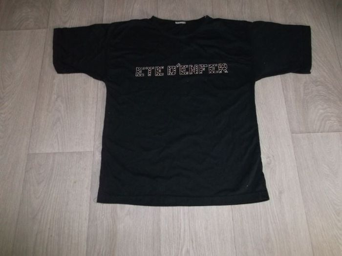 Tee shirt dégriffé de couleur noir, taille 42/44 (voir mesures), manches courtes, avec la mention devant "ETE D'ENFER" avec des clous. BE Epaule à épaule : 54 cms Aisselle à aisselle : 50 cms Longueur : 67 cms