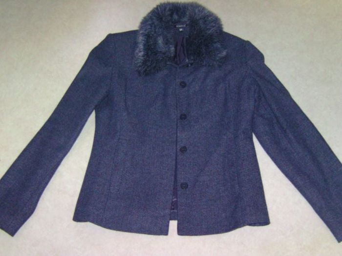 Veste très habillée de marque KOOKAI, taille 38, en polyester, acrylique et laine, se fermant devant par des boutons cachés, col en fausse fourrure, couleur gris noir. TBE Epaule à épaule : 40 cms Aisselle à aisselle : 48 cms Longueur : 65 cms