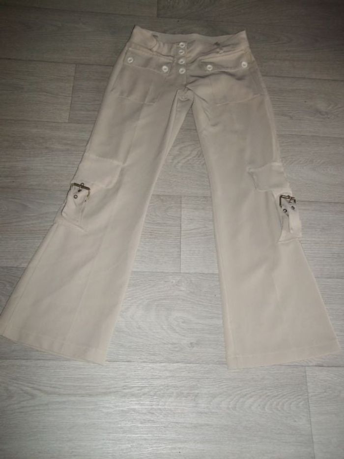 Pantalon de couleur beige, taille S, fluide, léger, se fermant devant par des boutons, 2 poches avant fermées par boutons, 2 fausses poches sur les jambes avec une boucle, légèrement élastiqué et évasé. Made in France.TBE Tour de taille à plat : 36 cms Longueur : 96 cms Largeur bas à plat : 25 cms