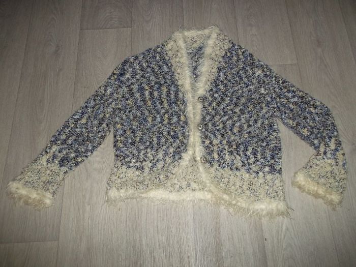 Veste gilet, dégriffé, taille environ L/XL (voir mesures), se fermant devant par 3 boutons, en bouclettes de couleur multicolore tons bleus, le bas des manches, le bas arrondi et le devant en fausse fourrure crème. TBE Epaule à épaule : 50 cms Aisselle à aisselle : 57 cms Longueur : 63 cms