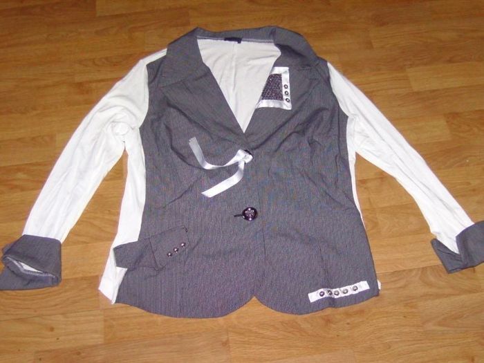 Veste tee shirt de marque SISTER'S MORE, taille XL, mi veste grise avec de fines lignes blanches devant, paillettes, décos boutons et satin , et sur l'arrière matière tee shirt blanc ainsi que les manches. Très légère et originale. NEUVE