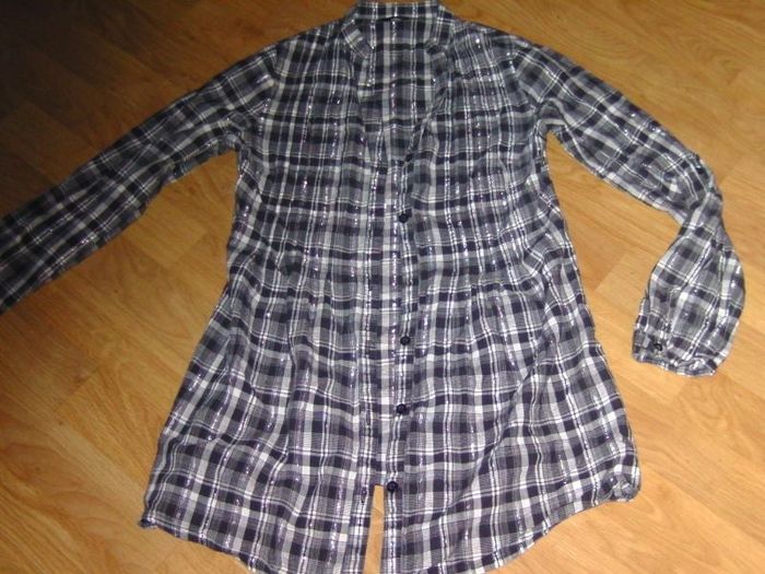 Chemise tunique de marque MIM, taille 34, de couleur noire grise argent blanche à carreaux, se fermant devant par des boutons, possibilité de mettre une ceinture dans les passants. TBE