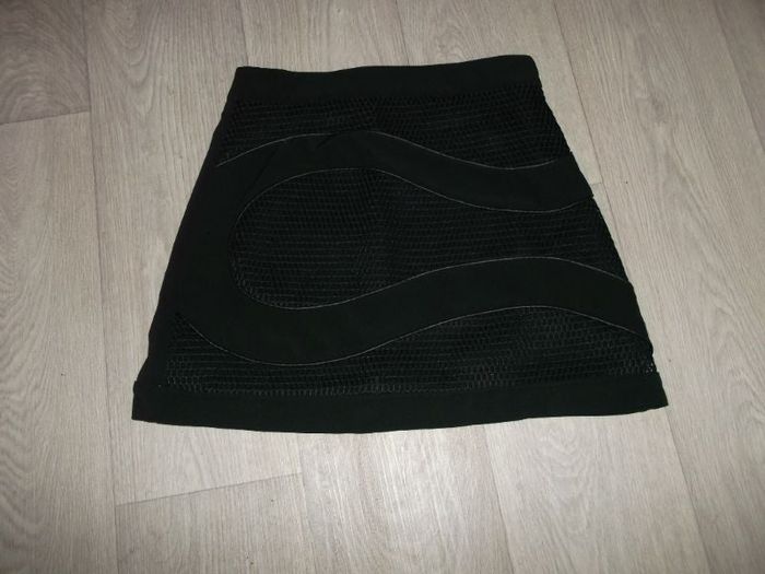 Jupe de marque NANA BAILA, taille 3/40/L, de couleur noire, se fermant sur l'arrière par une fermeture zip quasi invisible, et devant, en déco, une sorte de filet avec des formes géométriques avec le tissu, doublée sauf au bas ce qui laisse apparaitre une partie des jambes. NEUVE Tour de taille à plat : 39 cms Longueur : 42 cms