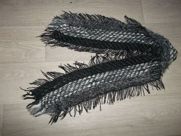Echarpe de plusieurs textures avec des franges sur tous les côtés, de couleur noire, grise, blanche et bleu outremer. TBE Longueur avec les franges : 156 cms Largeur avec les franges : 25 cms