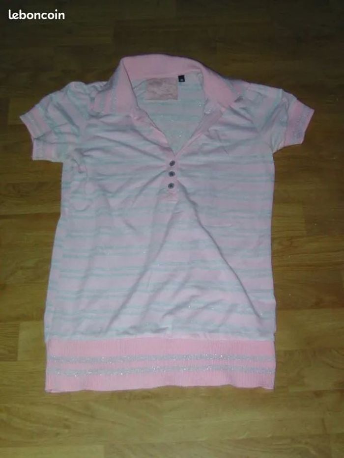 Polo, taille 38, de couleur rose avec des lignes épaisses gris argenté, se fermant devant par des boutons, bas élastiqué. TBE Epaule à épaule : 33 cms Aisselle à aisselle : 43 cms Longueur : 64 cms