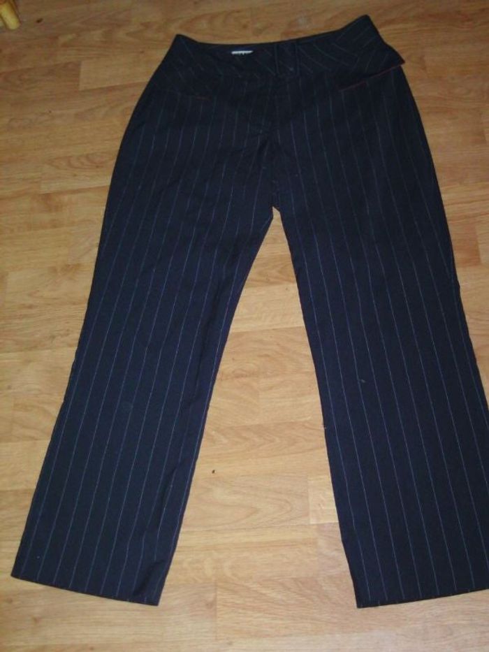 Pantacourt de marque YESSICA, taille 36 FR, de couleur noir avec de fines rayures blanches, se fermant devant par fermeture zip, un bouton intérieur et une ceinture intégrée avec boucle plastique noire, 2 fausses poches à rabats sur les cotés. NEUF Tour de taille à plat : 35 cms