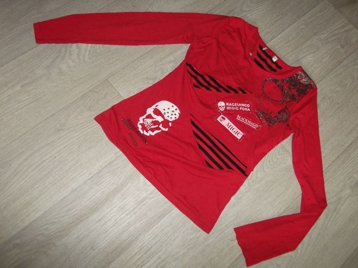 Tee shirt dégriffé, taille 3, de couleur rouge et noir double avec 2 ouvertures devant et et 2 en haut du dos, des décos têtes de mort partout, des clous, des lacets et de l'argenté sur le haut. TBE