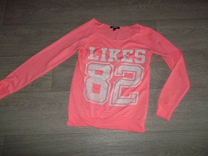 Sweat léger de marque JENNYFER, taille XS, col rond, de couleur rose fluo avec la mention "Likes 82" devant en blanc. Bon état.