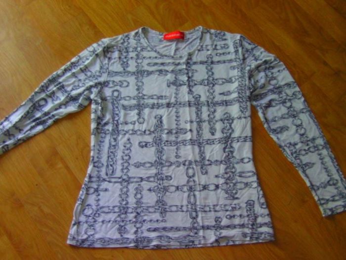 Tee shirt de marque ALAIN MANOUKIAN, taille 2 ou 38, manches longues, fluide, blanc avec des motifs chainettes. TBE
