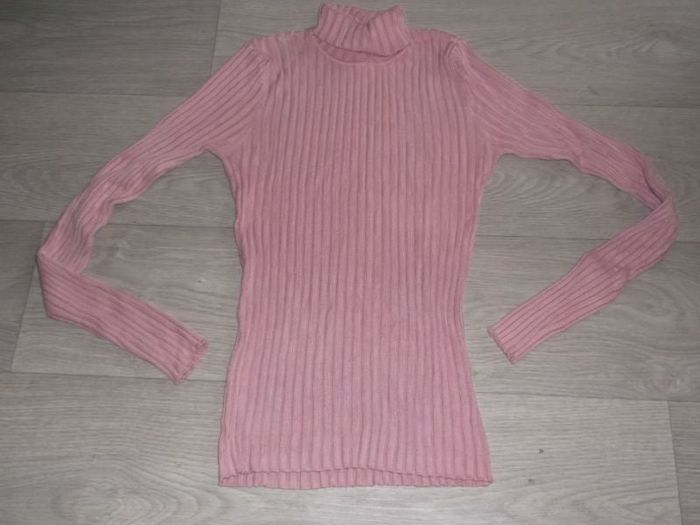Pull de marque LA CITY, taille 2/38/M, long, de couleur rose, col roulé . TBE Epaule à épaule : 36 cms Aisselle à aisselle : 42 cms Longueur : 69 cms