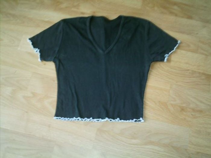 Tee shirt noir court, voile fluide, col en V, manches courtes avec des liserés blancs au bas et aux manches taille 36. TBE