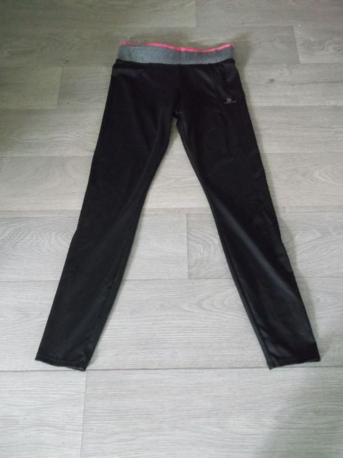 Legging de marque DOMYOS , taille 40, pour le sport, en polyester et élasthane, de couleur noir avec la ceinture élastique grise et rose fuchsia. TBE