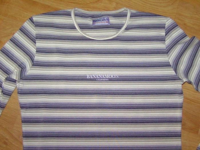 Tee shirt de marque BANANA MOON, taille M, en acrylique manches longues, avec des rayures grise foncées, claires, kaki et blanches, la marque est inscrite en blanc devant. TBE