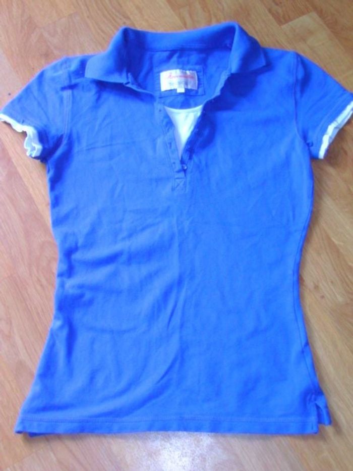 Polo de marque YESSICA DE C ET A , taille XS soit 34, de couleur bleu moyen avec du blanc au bout des manches courte et sur le devant vers les boutons. TBE