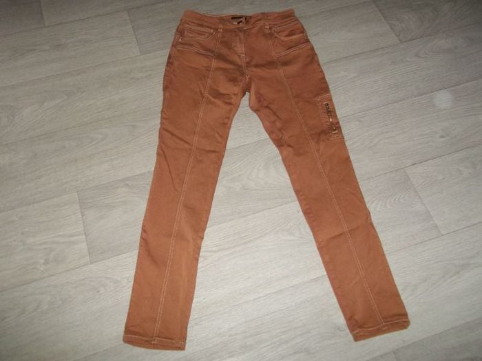 Jean de marque BREAL, taille haute, 42, (voir mesures plus d'étiquette), de couleur rouille, se fermant devant par fermeture zip et un bouton siglé, 2 poches avant et 2 sur l'arrière avec des rivets dorés siglés et strass, 1 poche zippée sur une jambe, coutures apparentes ocre, passants pour ceinture, légèrement élastiqué. TBE sauf une petite décoloration sur l'arrière (voir dernière photo). Tour de taille à plat : 38 cms Longueur : 102 cms