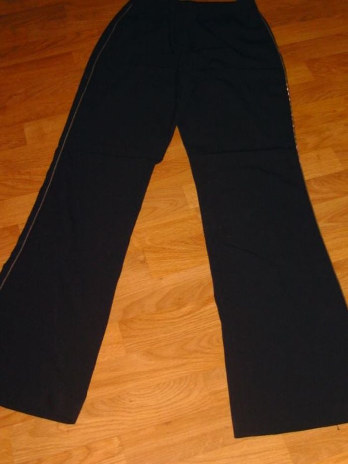 Pantalon de marque ALAIN MANOUKIAN, taille 36, de couleur noir, se fermant devant par fermeture zip un bouton et un crochet, une poche zippée sur l'arrière, sur les cotés extérieurs des deux jambes un liseré de glissière zip qui rend ce pantalon très original. Tour de taille à plat : 35 CMS Longueur : 112 CMS