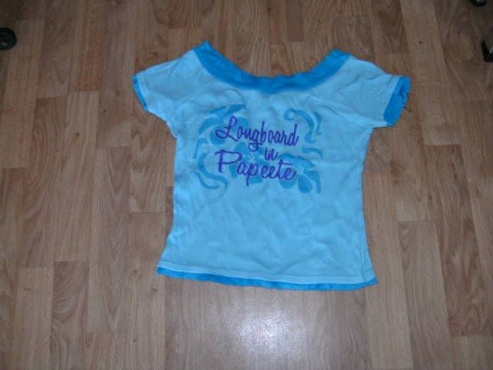 Tee shirt JENNYFER bleu turquoise lettres violettes "Papeete" taille M TBE