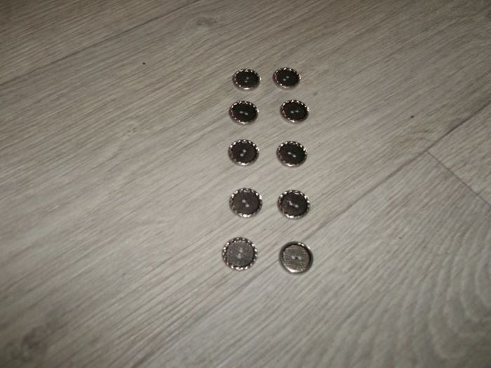 Lot de 10 boutons de couleur argentés, ronds, striés autour d'un côté, pouvant être utilisés sur les 2 faces. NEUF Diamètre : 2 cms Plusieurs lots disponibles.